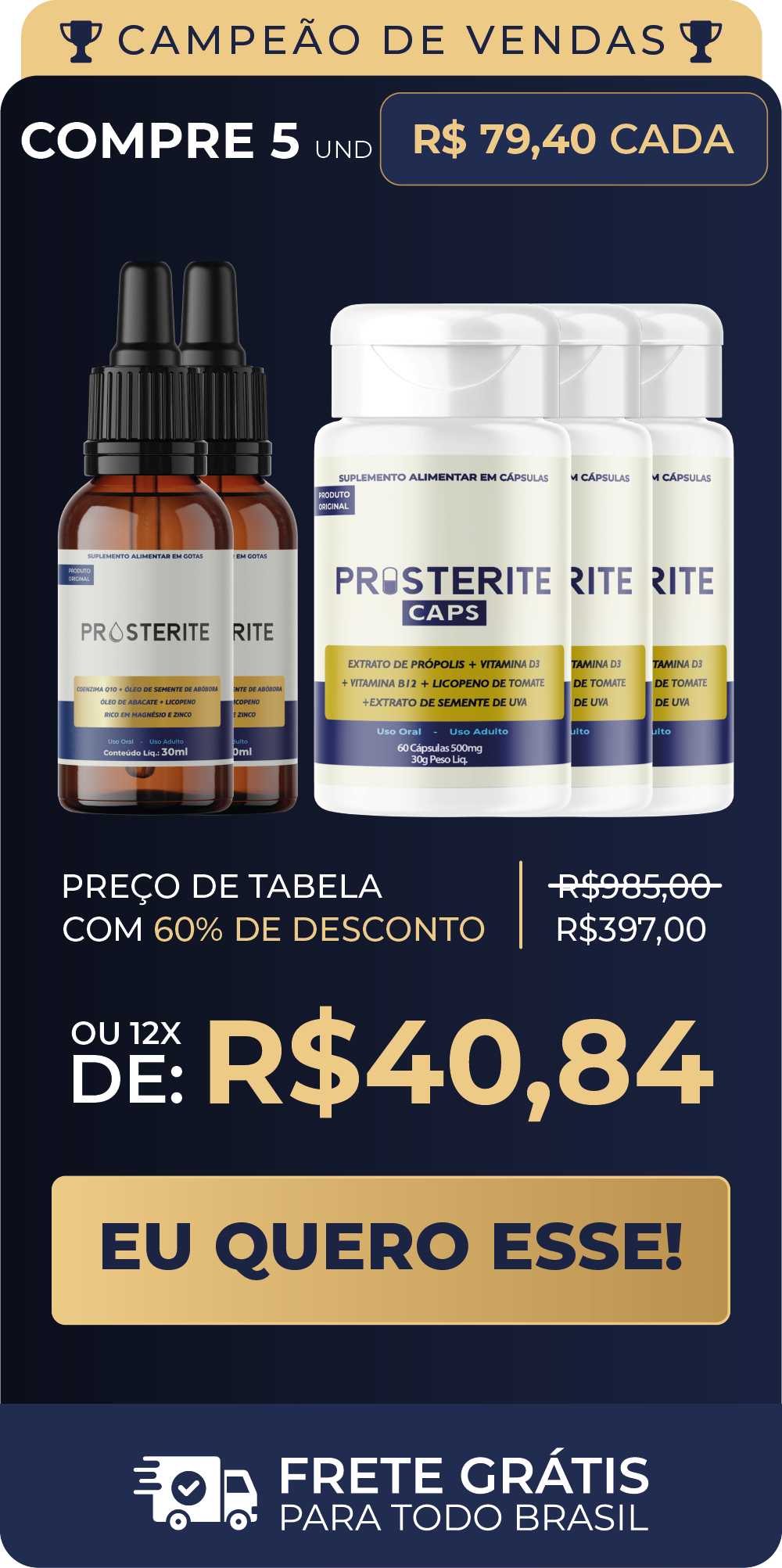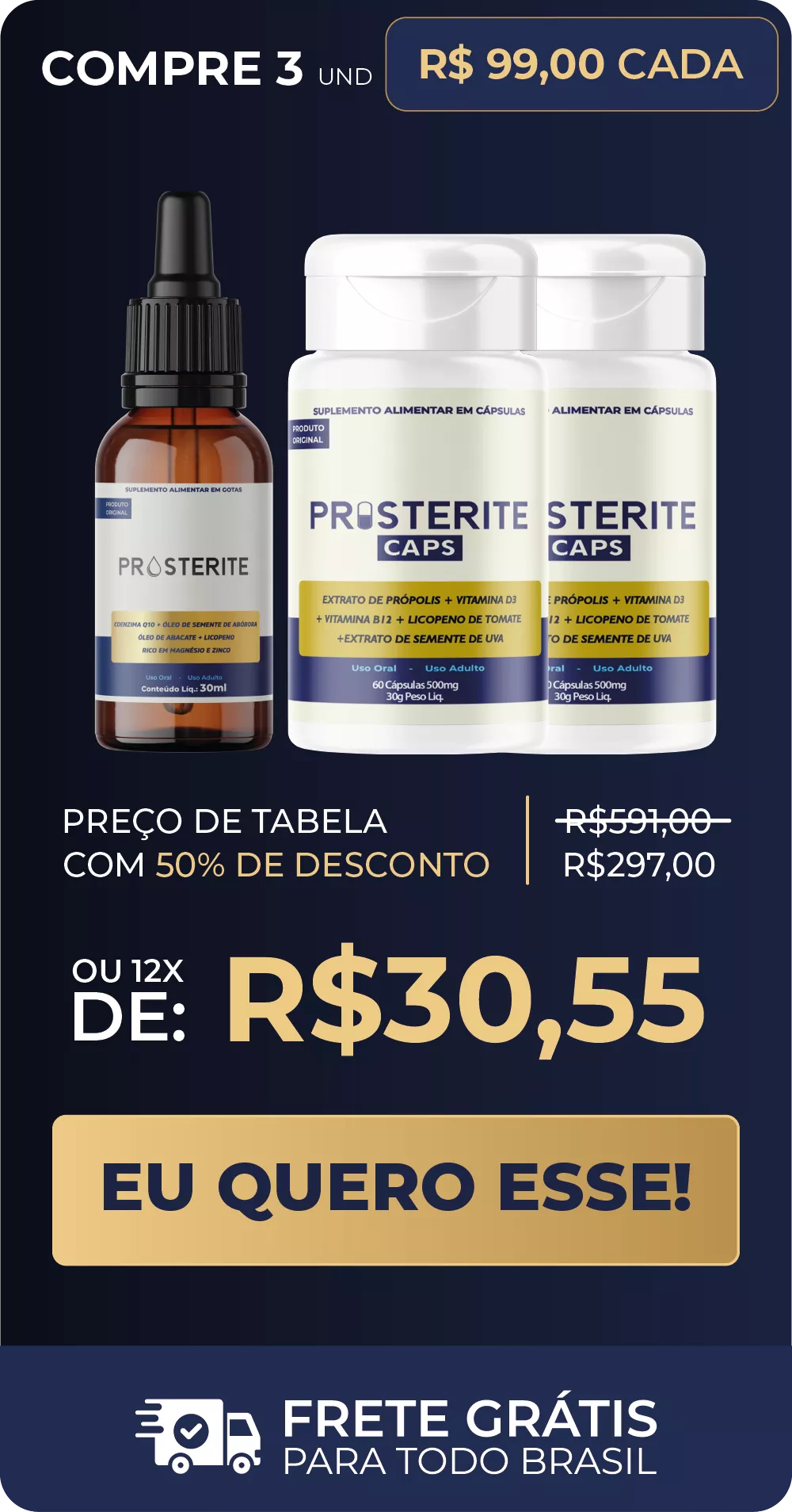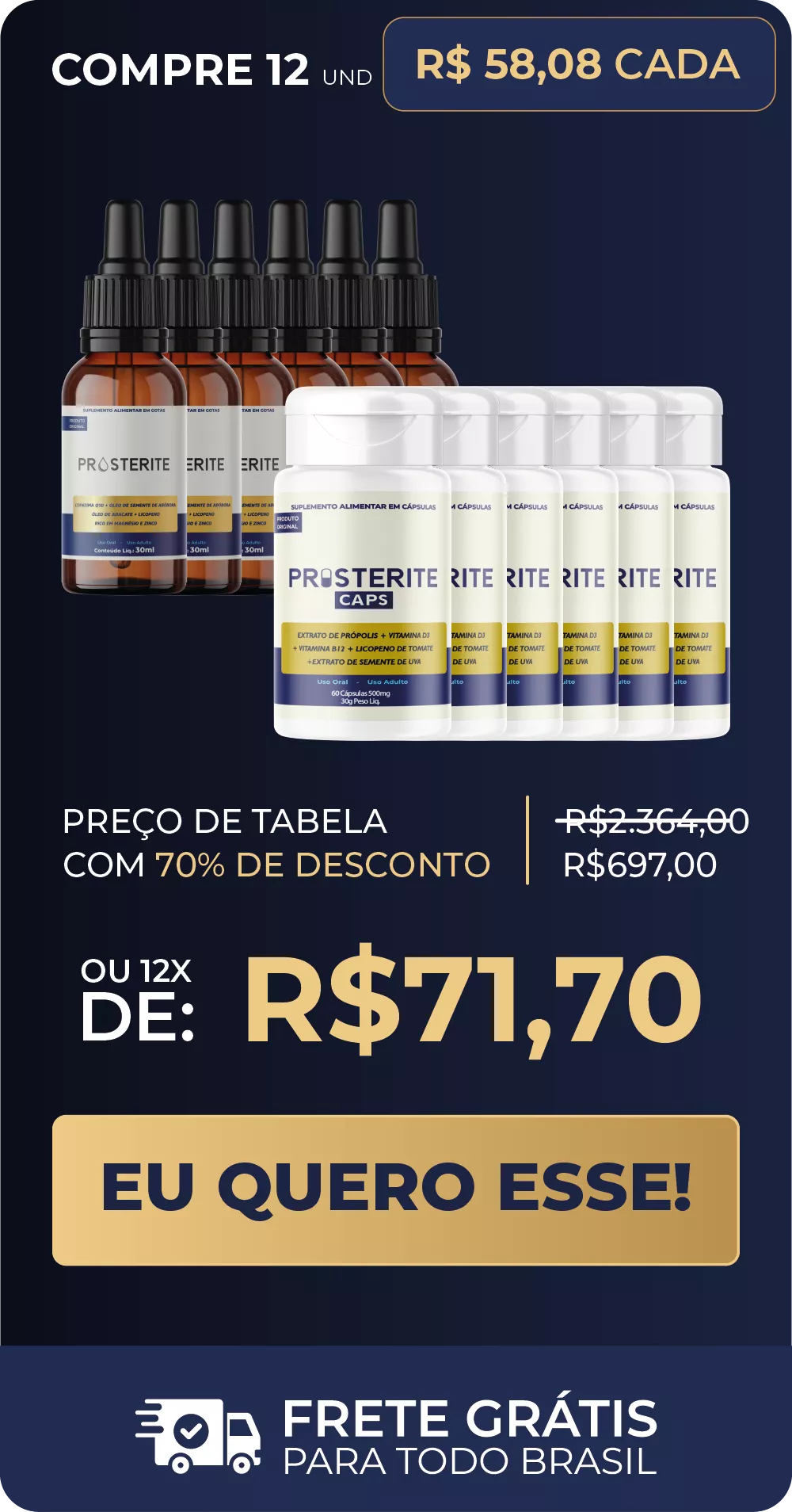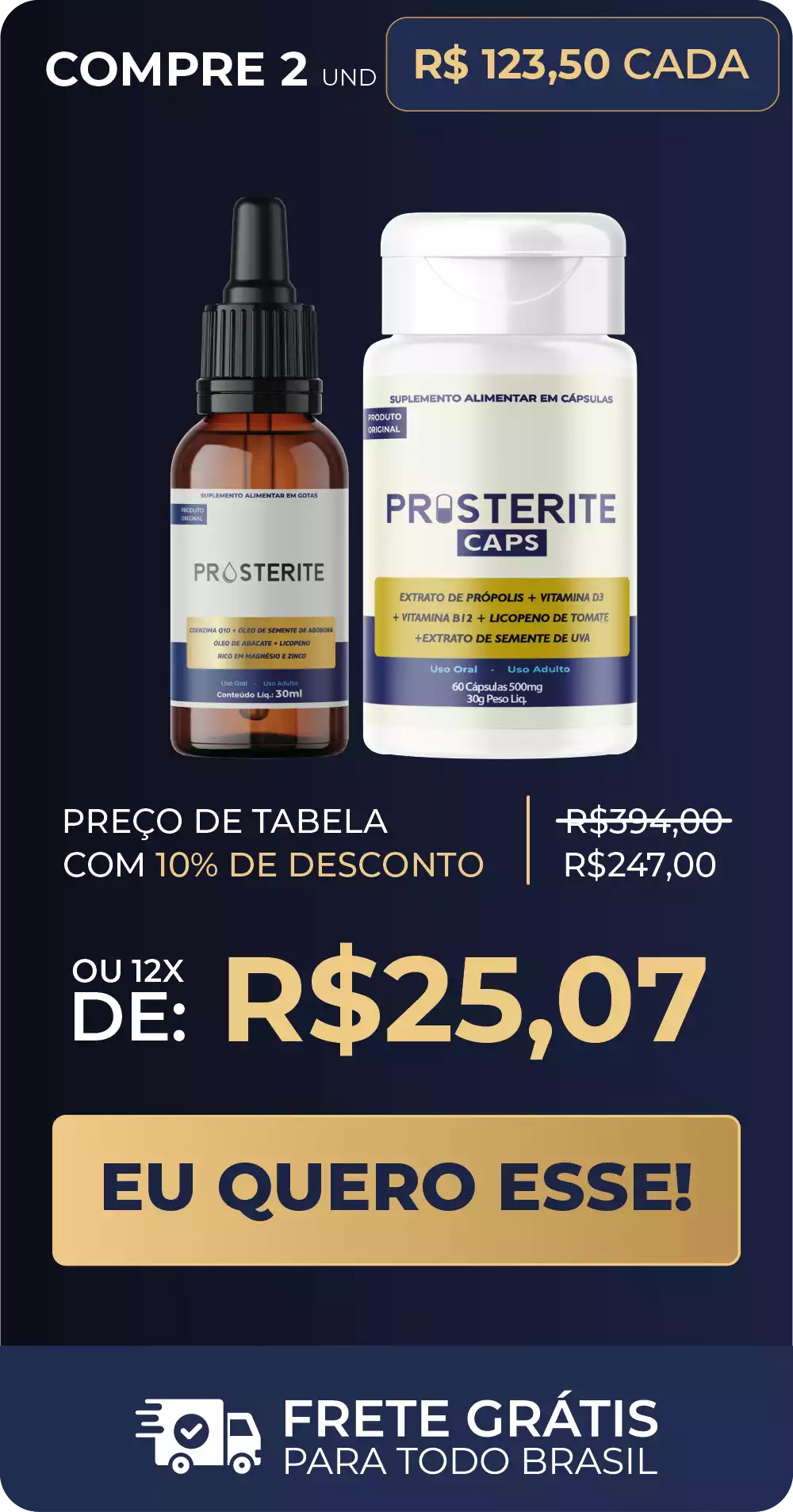 O tratamento Prosterite é único porque combina o melhor da natureza e da ciência em dois formatos complementares: as Gotas e as Cápsulas. Essa combinação potencializa a eficácia do tratamento, garantindo resultados mais rápidos e duradouros para quem busca alívio de sintomas e proteção contra problemas prostáticos.